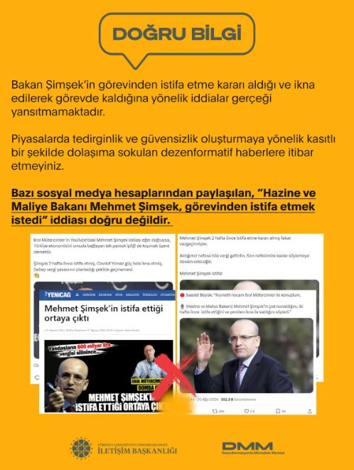 Bakan Mehmet Şimşek hakkında sosyal medyada gezen istifa iddiaları vardı. Dezenformasyonla Mücadele Merkezi bu iddiaların yalan olduğunu ortaya çıkardı.