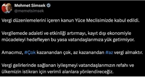 Hazine ve Maliye Bakanı Mehmet Şimşek, vergi düzenlemelerini içeren kanunun Meclis'te kabul edildiğini duyurarak, "Amacımız, çok kazanandan çok, az kazanandan az vergi almaktır." dedi.