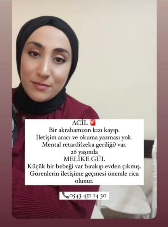 Melike Gül’ü görenlerin veya nerede olduğunu bilenlerin, ailesine yardımcı olabilmesi için dayısı ile 0543 451 14 30 numaralı telefon üzerinden iletişime geçmesi rica ediliyor.