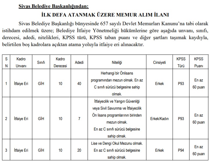 Resmi gazetede yayımlanan ilana göre, İLK DEFA ATANMAK ÜZERE MEMUR ALIM İLANI Sivas Belediye Başkanlığı bünyesinde 657 sayılı Devlet Memurları Kanunu’na tabi olarak istihdam edilmek üzere; Belediye İtfaiye Yönetmeliği hükümlerine göre aşağıda unvanı, sınıfı, derecesi, adedi, nitelikleri, KPSS türü, KPSS taban puanı ve diğer şartları taşımak kaydıyla, belirtilen boş kadrolara açıktan atama yoluyla itfaiye eri alınacaktır.