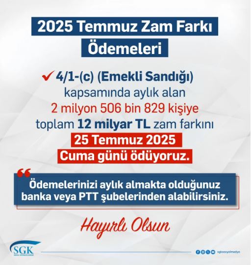 Sosyal Güvenlik Kurumu (SGK), 4/1-(c) yani Emekli Sandığı kapsamında aylık alan emeklilere yönelik Temmuz 2025 zam farkı ödemelerinin tarihini duyurdu.