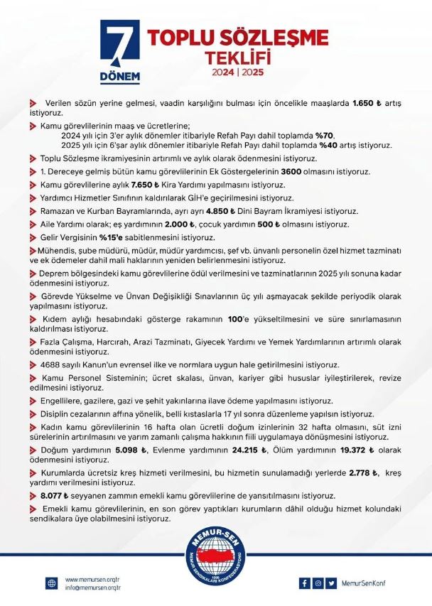 Memur-Sen, maaş artış oranları ve kira yardımının da aralarında olduğu bir çok talebini açıkladı.
