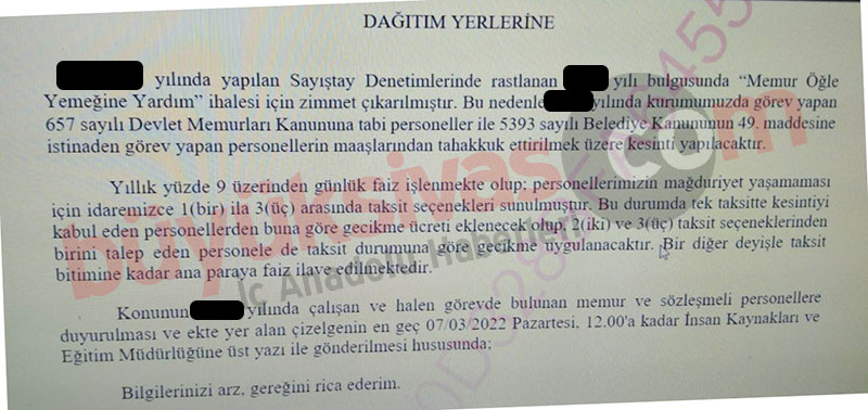 Yapılan yemek ihalesinde sayıştay denetçisinin bulduğu usulsüzlük sonrası resmi yazı ile memurlardan bu paranın tekrar alınacağı ifade edildi.
