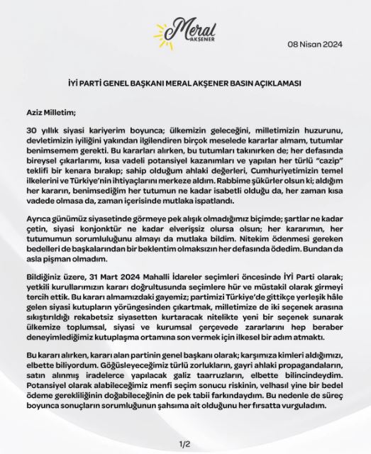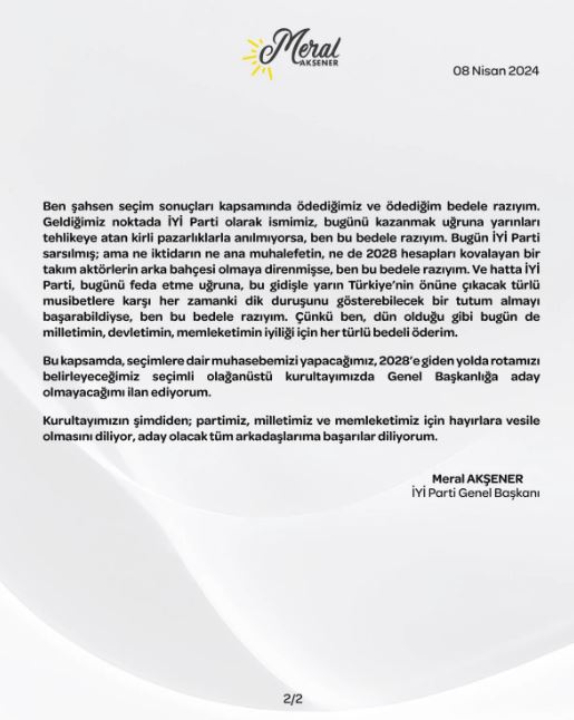 İyi Parti Genel Başkanı Meral Akşener, Olağanüstü Genel Kurul'da aday olmayacağını açıkladı.