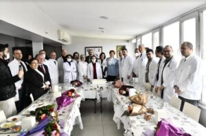 Hastane yönetimince pasta kesilmesinin ardından Akşener, hastanede görevli doktorlarla fotoğraf çektirdi.