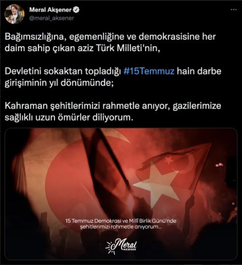 Meral Akşener'in Twitter hesabından yaptığı 15 Temmuz anma mesajında darbenin faili FETÖ ibaresini kullanmaması dikkat çekti.