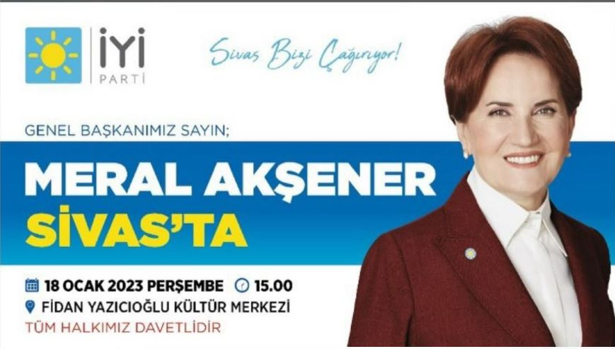 18 Ocak Perşembe günü Sivas'a gelecek Meral Akşener saat 15:00'te Fidan Yazıcıoğlu Kültür Merkezi'nde olacak. (Nursen Beste Yıldız)