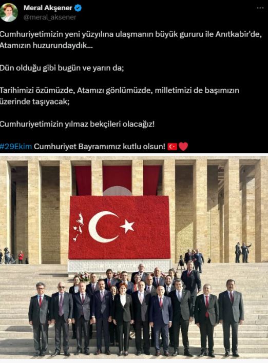 Partililerle Anıtkabir önünde hatıra fotoğrafı da çektiren Akşener, sosyal medya hesabından 100. yıla özel mesaj yayınladı.