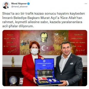 İYİ Parti Genel Başkanı Meral Akşener, Sivas'ta geçirdiği trafik kazasında hayatını kaybeden İmranlı Belediye Başkanı Murat Açıl’a rahmet, ailesine sabır diledi.