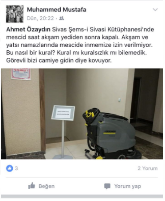 “Sivas Şemsi Sivas Kütüphanesi’nde mescid saat akşam yediden sonra kapalı. Akşam ve yatsı namazlarında mescide inmemize izin verilmiyor. Bu nasıl bir kural? Kural mı Kuralsızlık mı bilemedik. Görevli bizi camiye gidin diye kovuyor.”
