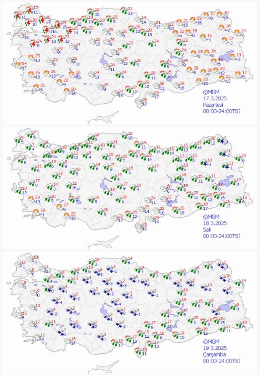 Meteoroloji, haftanın ilk günü için 26 ilde fırtına ve ani sıcaklık düşüşlerine karşı sarı uyarı yayımladı. Buna göre, Afyonkarahisar, Amasya, Ankara, Çankırı, Çorum, Denizli, Edirne, Eskişehir, Giresun, Isparta, Kayseri, Kırklareli, Kırşehir, Konya, Kütahya, Nevşehir, Niğde, Rize, Sivas, Tokat, Trabzon, Uşak, Yozgat, Aksaray, Karaman ve Kırıkkale sarı kod verilen iller arasında yer aldı.