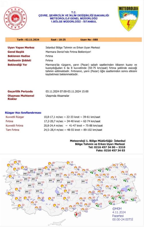 Meteoroloji tarafından 7 ile ise sarı kodlu uyarı verildi.