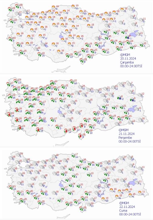 Meteoroloji tarafından yapılan son tahminlere göre, ülkemiz genelinin parçalı ve çok bulutlu, Orta ve Doğu Karadeniz, Doğu Anadolu (Malatya hariç), Güneydoğu Anadolu'nun doğusu ile Zonguldak, Bartın, Sinop, Karabük, Kastamonu, Hatay çevreleri, Antalya'nın doğu, Mersin'in batı ilçelerinin yağışlı geçeceği tahmin ediliyor.