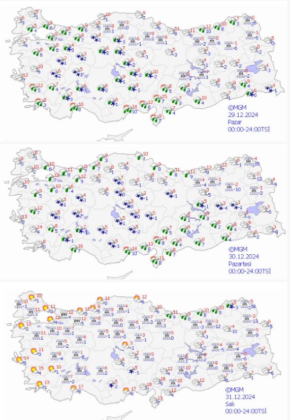 Meteoroloji Genel Müdürlüğü tarafından yapılan son tahminlere göre; Yurt genelinin parçalı ve çok bulutlu, Marmara’nın güney ve doğusu, Ege, Akdeniz, İç Anadolu’nun güney ve batısı, Doğu Karadeniz kıyıları, Doğu Anadolu'nun güneydoğusu, Güneydoğu Anadolu'nun batısı ile Bolu, Düzce, Zonguldak, Bayburt, Siirt ve Ağrı çevrelerinin yağışlı geçeceği tahmin ediliyor.