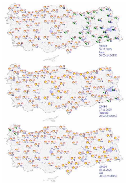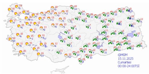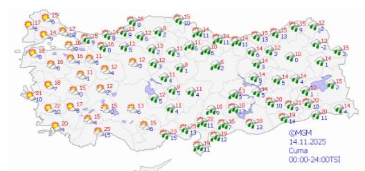 Rapora göre yurt genelinde hava parçalı ve çok bulutlu olacak. Marmara’nın doğusu, Doğu Akdeniz, İç Anadolu’nun doğusu, Karadeniz, Doğu Anadolu’nun kuzey ve batısı ile Güneydoğu Anadolu çevrelerinde yağmur ve sağanak bekleniyor.