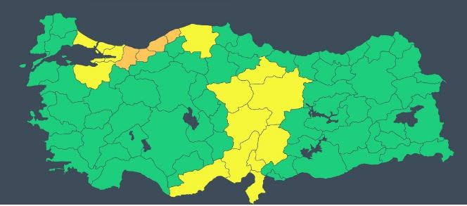 20 İL İÇİN SARI 4 İL İÇİN TURUNCU KODLU UYARI