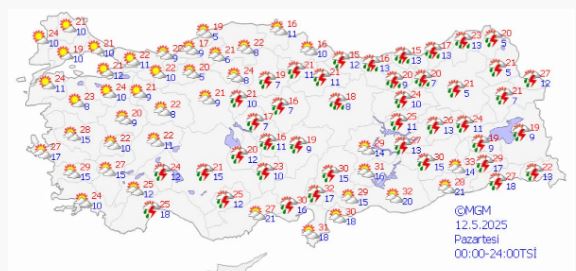 - Diyarbakır: 31°C, sağanak ve gök gürültülü sağanak yağışlı