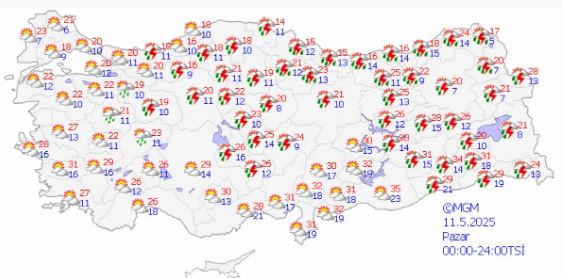 - Adana: 31°C, yerel sağanak ve gök gürültülü sağanak yağışlı