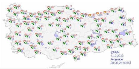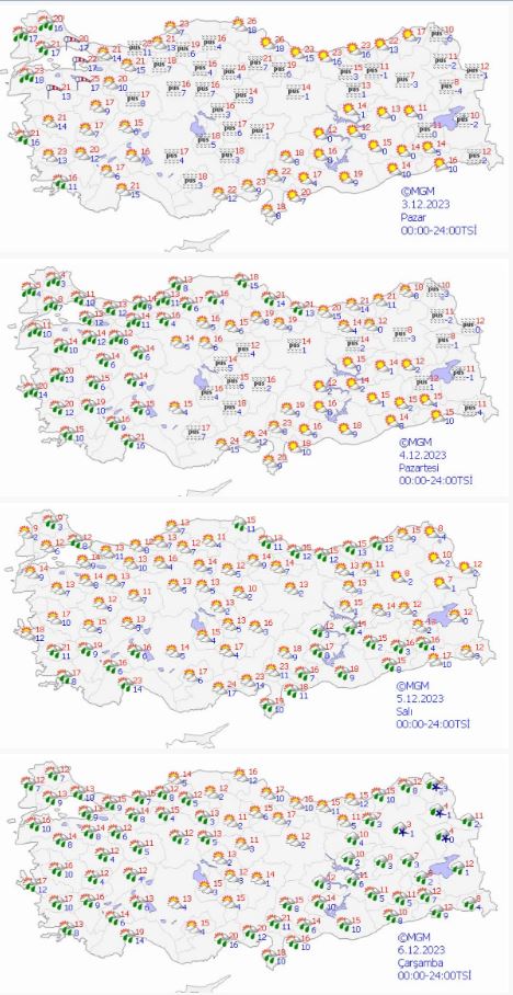 Diğer yerlerin ise az bulutlu ve açık geçeceği tahmin ediliyor. Gece ve sabah saatlerinde iç ve doğu bölgelerde yer yer pus ve sis bekleniyor.