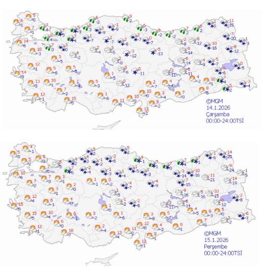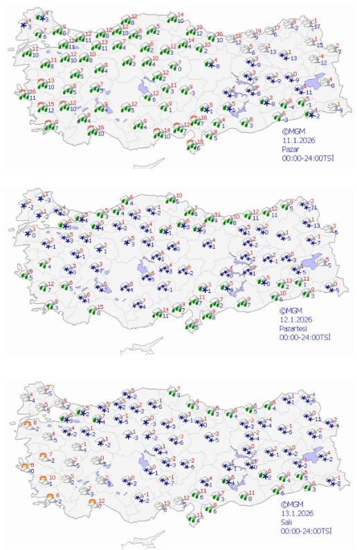 Kırklareli 3-4, İstanbul 8-9, Denizli 10-12, İzmir 11-16, Adana 7-12, Ankara 3-7, Samsun 12-19, Erzurum -13/1, Malatya -8/2, Kars -15/1, Diyarbakır -8/3, Gaziantep 1-4 derece.