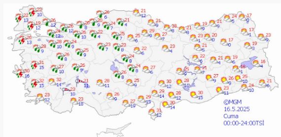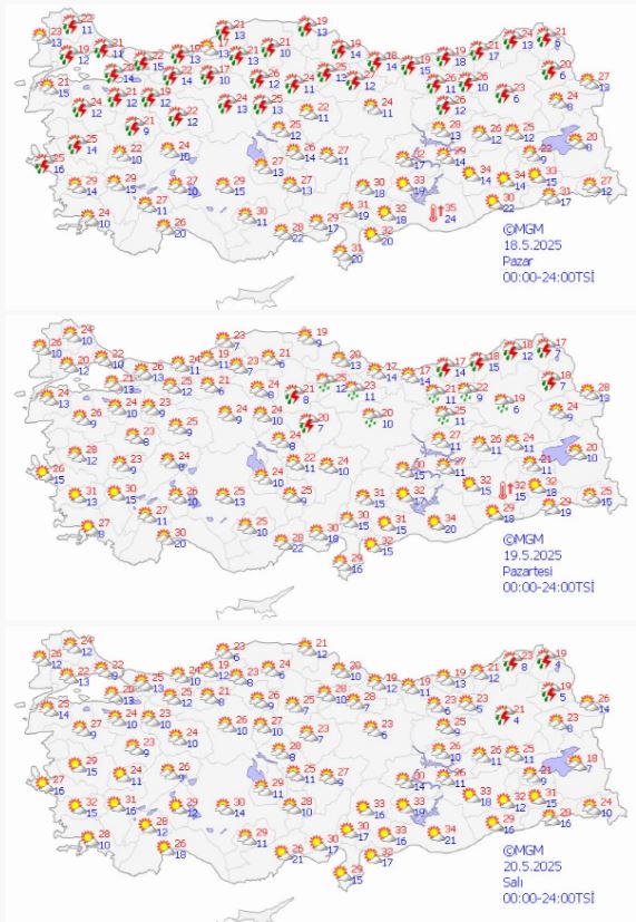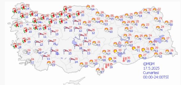 Yapılan son değerlendirmelere göre, Türkiye genelinde hava parçalı ve yer yer çok bulutlu olacak. Marmara, Ege (Muğla ve Denizli hariç), Batı Karadeniz (Sinop hariç), İç Anadolu’nun kuzeybatısı ile Antalya, Isparta ve Kırıkkale çevrelerinde aralıklı sağanak ve gök gürültülü sağanak yağış bekleniyor.