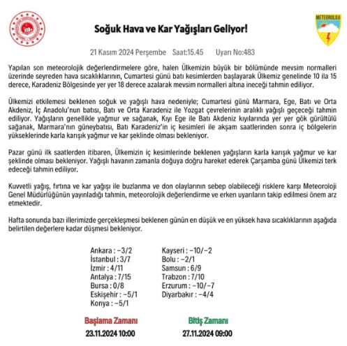 Meteoroloji'den yapılan açıklamada şu ifadelere yer verildi: