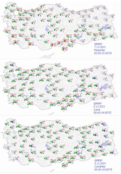 Meteoroloji Genel Müdürlüğü tarafından yapılan son değerlendirmeye göre; ülkemiz genelinin parçalı ve çok bulutlu, Marmara, Ege, Akdeniz, İç Anadolu'nun kuzey ve doğusu, Batı Karadeniz'in batısı, Orta Karadeniz'in iç kesimleri, Doğu Karadeniz'in doğusu, (Erzincan hariç) Doğu Anadolu , (Ş.Urfa hariç) Güneydoğu Anadolu'nun yağışlı geçeceği tahmin ediliyor.