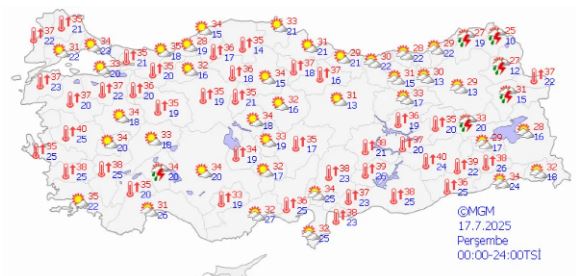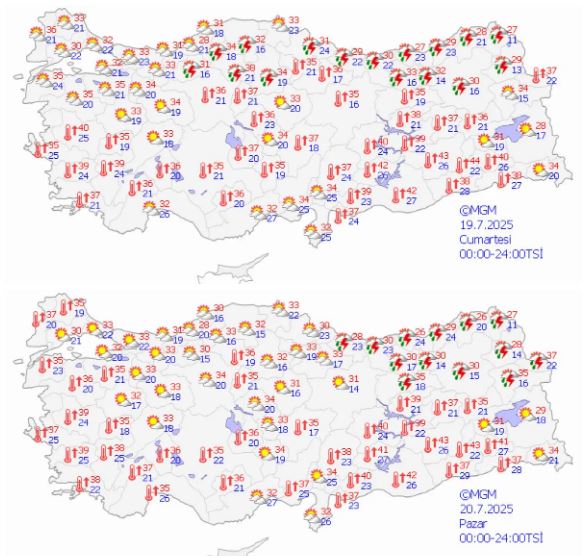 Son tahminlere göre hava sıcaklıklarında önümüzdeki günlerde önemli bir değişiklik beklenmiyor. Türkiye’nin büyük bölümünde sıcaklıklar mevsim normallerinin üzerinde kalmaya devam edecek. Güneydoğu Anadolu’da termometrelerin 40 derecenin üzerine çıkması beklenirken, Ege'de 35-40, Akdeniz’de ise 32-38 derece arasında sıcaklıklar ölçülecek.