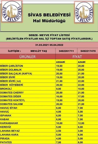Sivas'ta toptan olarak güncel hal fiyatları şu şekilde,