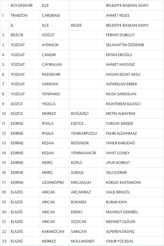 Milliyetçi Hareket Partisi Genel Başkan Yardımcısı Sadir Durmaz; “Partimizin yetkili kurullarının yapmış olduğu değerlendirme ve Genel Başkanımız Sayın Devlet BAHÇELİ’nin onayları sonucunda 31 Mart 2024 Mahalli İdareler Seçimlerinde 12. etap olarak adaylıkları kesinleşen 1 Büyükşehir İlçe, 8 İlçe, 46 Belde Belediye Başkan Adayımız olmak üzere toplam 55 adayımızın isim listesi aşağıdadır” dedi.
