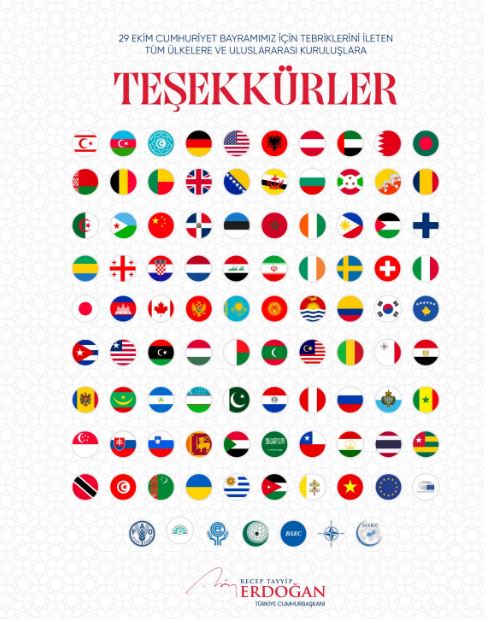 Cumhurbaşkanı Erdoğan’ın paylaşımında ayrıca, tebrik mesajı gönderen ülkelerin bayrakları ve uluslararası kuruluşların logoları da yer aldı.