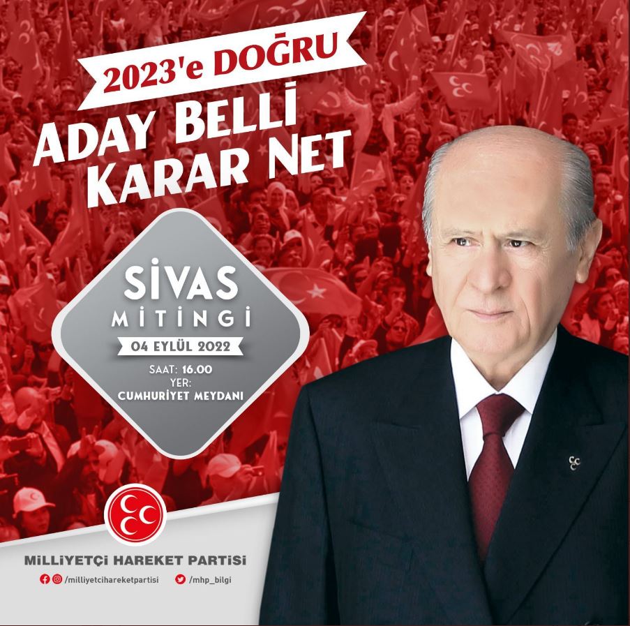 Milliyetçi Hareket Partisi 2023'e Doğru Aday Belli Karar Net sloganı ile ilk mitingini bugün Sivas'ta gerçekleştiriyor.