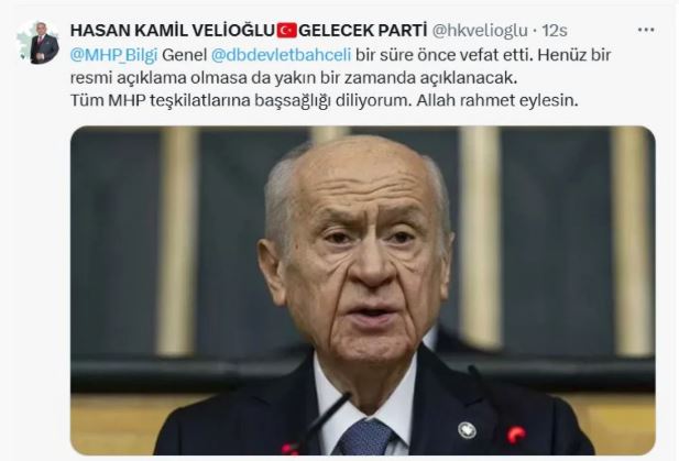 Bahçeli’nin vefat ettiğini öne süren Gelecek Partisi Trabzon İl Başkanı Hasan Kamil Velioğlu, sosyal medyada yaptığı paylaşımda "Devlet Bahçeli bir süre önce vefat etti. Henüz resmi açıklama olmasa da yakın bir zamanda açıklanacak" ifadelerini kullanmıştı.