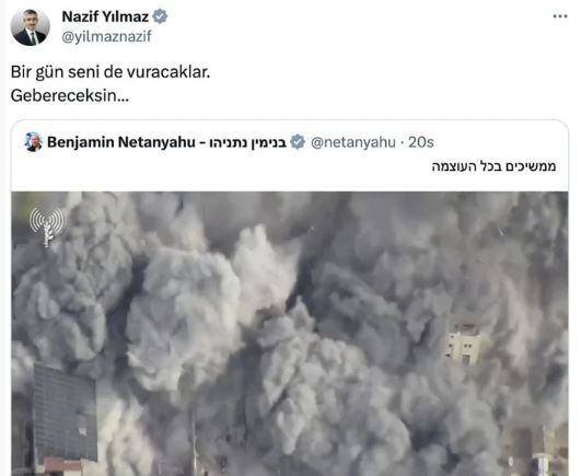 İsrail Başbakanı Binyamin Netanyahu, savaş uçaklarının Gazze'yi bombaladığı anları paylaşarak, "Tüm gücümüzle devam edelim" notunu ekledi. Bu paylaşımı alıntılayan Milli Eğitim Bakan Yardımcısı Nazif Yılmaz, "Gebereceksin" diyerek tepki gösterdi.