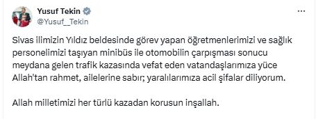 "Sivas ilimizin Yıldız beldesinde görev yapan öğretmenlerimizi ve sağlık personelimizi taşıyan minibüs ile otomobilin çarpışması sonucu meydana gelen trafik kazasında vefat eden vatandaşlarımıza yüce Allah'tan rahmet, ailelerine sabır; yaralılarımıza acil şifalar diliyorum.