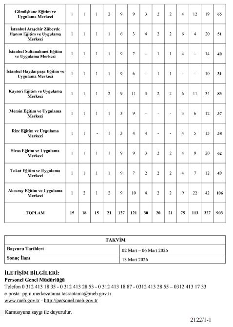 Personel alımı; Gümüşhane, İstanbul Ataşehir Zübeyde Hanım, İstanbul Sultanahmet, İstanbul Haydarpaşa, Kayseri, Mersin, Rize, Sivas, Tokat ve Aksaray Eğitim ve Uygulama Merkezleri başta olmak üzere çeşitli merkezlerde gerçekleştirilecek. Tabloda yer alan bilgilere göre toplam kontenjan sayısı 903 olarak açıklandı.