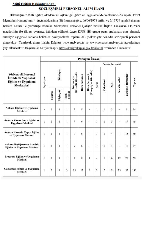 Millî Eğitim Bakanlığı 903 Sözleşmeli Personel Alacak.. Millî Eğitim Bakanlığı, Millî Eğitim Akademisi Başkanlığı bünyesinde görev yapmak üzere sözleşmeli personel alımı yapılacağını duyurdu. KPSS (B) grubu puan sıralaması esas alınarak gerçekleştirilecek alım kapsamında farklı illerdeki Eğitim ve Uygulama Merkezlerinde görevlendirilmek üzere toplam 903 personel istihdam edilecek.