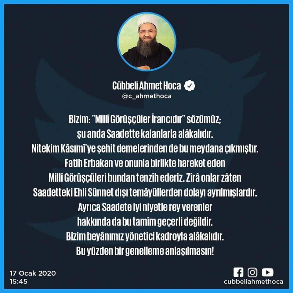 Cübbeli Ahmet, sözlerinin yanlış anlaşıldığını düşündüğü gerekçesiyle sosyal medya hesabından yeni bir paylaşım yaparak, Milli Görüş'ü adeta ikiye ayırdı. Cübbeli Ahmet, yaptığı paylaşımda, ''Bizim: "Millî Görüşçüler İrancıdır" sözümüz; şu anda Saadette kalanlarla alâkalıdır. Nitekim Kâsımî'ye şehit demelerinden de bu meydana çıkmıştır. Fatih Erbakan ve onunla birlikte hareket eden Millî Görüşçüleri bundan tenzîh ederiz.Zîrâ onlar zâten Saadetteki Ehli Sünnet dışı temâyüllerden dolayı ayrılmışlardır. Ayrıca Saadete iyi niyetle rey verenler hakkında da bu tamîm geçerli değildir. Bizim beyânımız yönetici kadroyla alâkalıdır. Bu yüzden bir genelleme anlaşılmasın!'' ifadelerini kullandı.