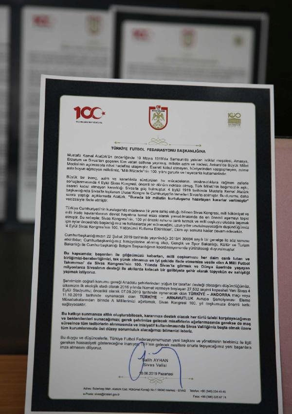 Sivas Valiliği, Sivas Kongresi'nin 100'üncü yılı etkinlikleri kapsamında A Milli Futbol Takımı'nın, 2020 Avrupa Futbol Şampiyonası (EURO 2020) Elemeleri H Grubu'nda yapacağı maçlarından birinin Sivas'ta oynatılması için Türkiye Futbol Federasyonuna (TFF) talepte bulunmuş ve mektup yazmıştı.