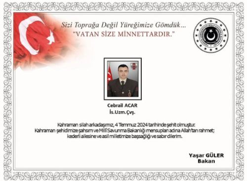 Bu acı kayıp, Türk Silahlı Kuvvetleri ve tüm Türkiye'yi derin bir üzüntüye boğdu. Milli Savunma Bakanlığı, açıklamasında şehit Uzman Çavuş Cebrail Acar için Allah’tan rahmet, kederli ailesine ve asil millete başsağlığı ve sabır diledi.