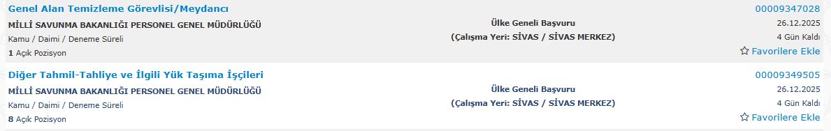 Tüm pozisyonlar kamu / daimi / deneme süreli statüde olup, çalışma yeri Sivas Merkez olarak belirtildi.