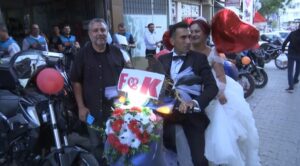 Elazığ’da motosiklet derneğinden tanışarak evlenme kararı alan Kadir ve Fatma Ertürk çifti, motosiklet tutkularını düğünlerinde de gösterdi. Gelin arabası yerine çift, motosikletlerini süsleterek gelin motosikleti yaptı.