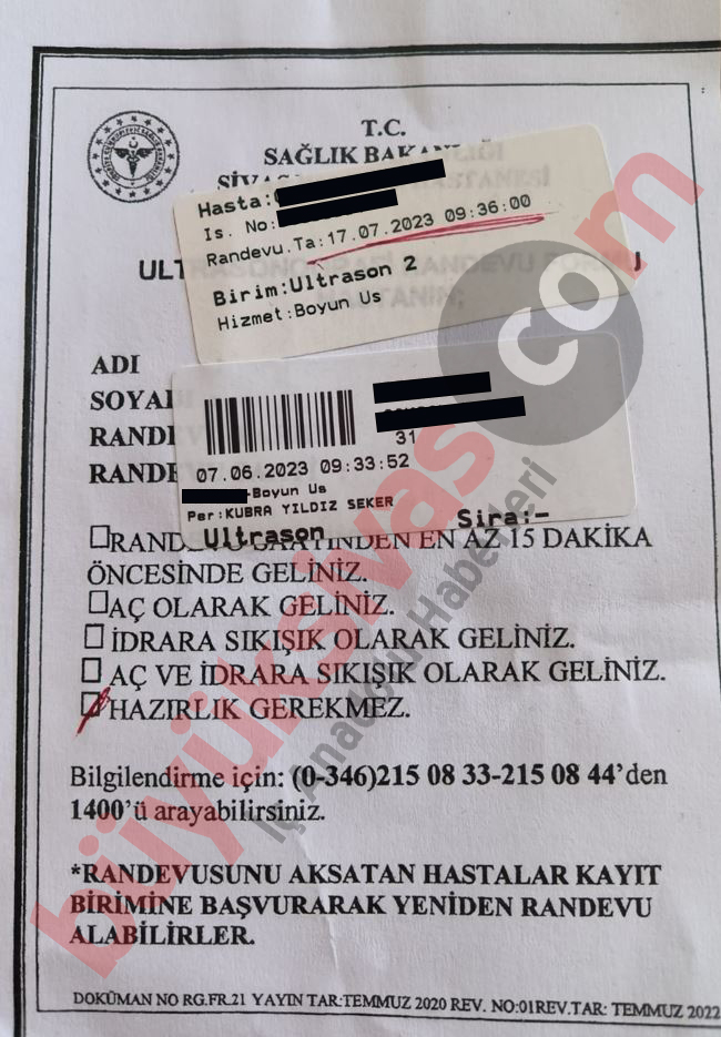 Tedavi için Sivas'ta hastanelere giden ve ultrason istenen bir hastaya, en erken 45 gün sonraya gün veriliyor.