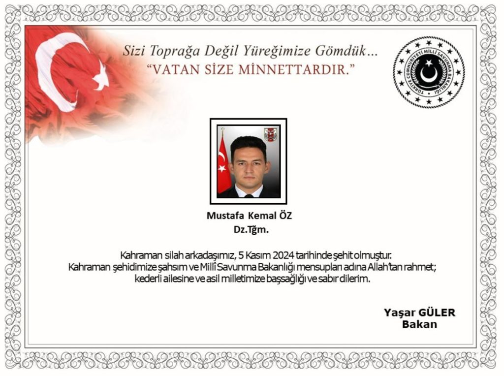 MSB’den yapılan yazılı açıklamada, “Riva Beykoz / İstanbul Su Altı Savunma Komutanlığında, eğitim esnasında, 5 Kasım 2024 tarihinde meydana gelen kaza sonucunda yaralanan kahraman silah arkadaşımız Deniz Teğmen Mustafa Kemal Öz, derhal kaldırıldığı hastanede yapılan tüm müdahalelere rağmen kurtarılamayarak şehit olmuştur. Bizleri derin bir acı ve üzüntüye boğan bu olayda hayatını kaybeden aziz şehidimize Allah’tan rahmet, kederli ailesine, Türk Silahlı Kuvvetleri ile asil milletimize başsağlığı ve sabır dileriz” ifadelerine yer verildi.