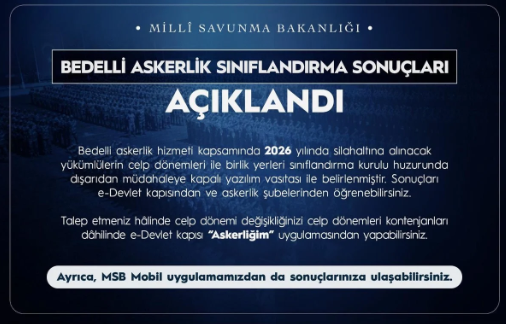 MSB’den yapılan açıklamada, “Bedelli Askerlik Sınıflandırma Sonuçları Açıklandı. Bedelli askerlik hizmeti kapsamında 2026 yılında silahaltına alınacak yükümlülerin celp dönemleri ve birlik yerleri belirlenmiştir.” ifadelerine yer verildi.