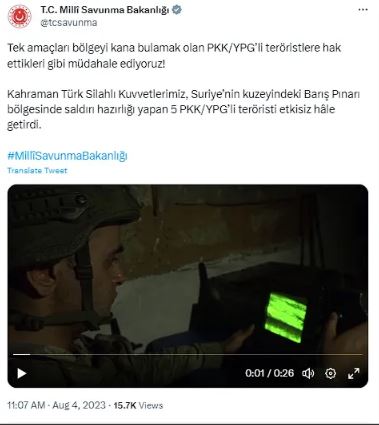 MSB'den yapılan açıklamada, "Tek amaçları bölgeyi kana bulamak olan PKK/YPG'li teröristlere hak ettikleri gibi müdahale ediyoruz. Kahraman Türk Silahlı Kuvvetlerimiz, Suriye'nin kuzeyindeki Barış Pınarı bölgesinde saldırı hazırlığı yapan 5 PKK/YPG'li teröristi etkisiz hale getirdi." ifadeleri kullanıldı.