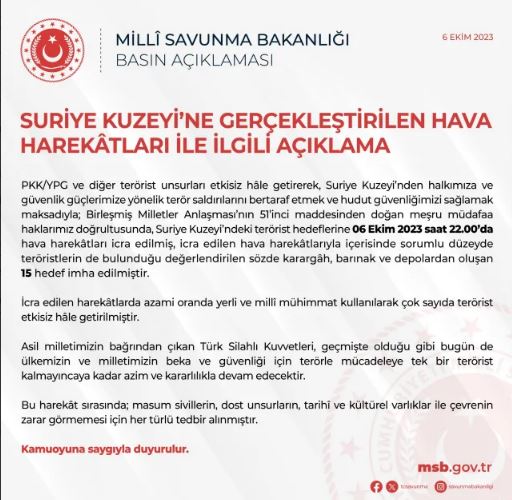 Bakanlıktan yapılan açıklamada, "Suriye'nin kuzeyine saat 22.00'de hava harekatları düzenlenmiş, teröristlerin kullandığı sözde karargah, barınak ve depolardan oluşan 15 hedef imha edilmiştir." ifadelerine yer verildi.