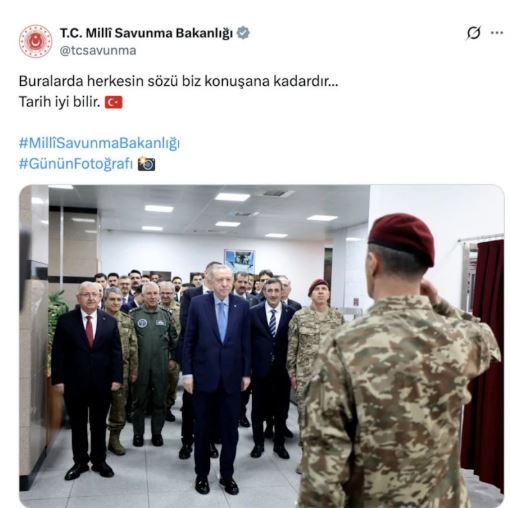 MSB’den Erdoğan Paylaşımı Dikkat Çekti.. Milli Savunma Bakanlığı (MSB), Cumhurbaşkanı Recep Tayyip Erdoğan’ın yer aldığı bir kareyi dikkat çeken bir notla paylaştı. Bakanlığın paylaşımında, “Buralarda herkesin sözü biz konuşana kadardır. Tarih iyi bilir.” ifadeleri kullanıldı.