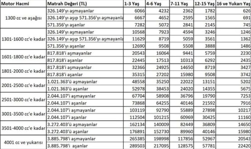 Yeni tarifeye göre otomobiller için belirlenen MTV tutarları şöyle: