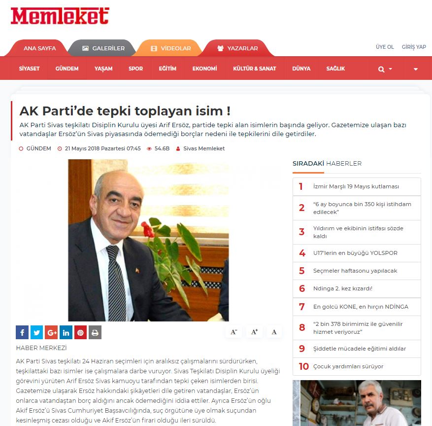 Sivas Memleket gazetesinde yer alan habere göre, AK Parti Sivas il Disiplin Kurulu Başkanı Arif Ersöz'ün, partide tepki alan isimlerin başında geldiği iddia edilmişti. Memleket gazetesine ulaşan bazı vatandaşların, Ersöz’ün Sivas piyasasında ödemediği borçlar nedeni ile tepkilerini dile getirdiği belirtildi.